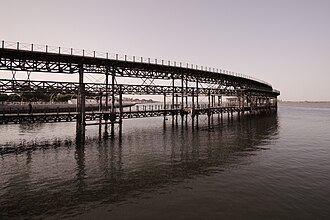 Estructura de hierro y madera (la original era de madera, la actual es reconstrucción) que se adentra en el río Odiel. Es accesible al público y uno de los pocos lugares desde donde se puede ver la actividad portuaria de cerca.